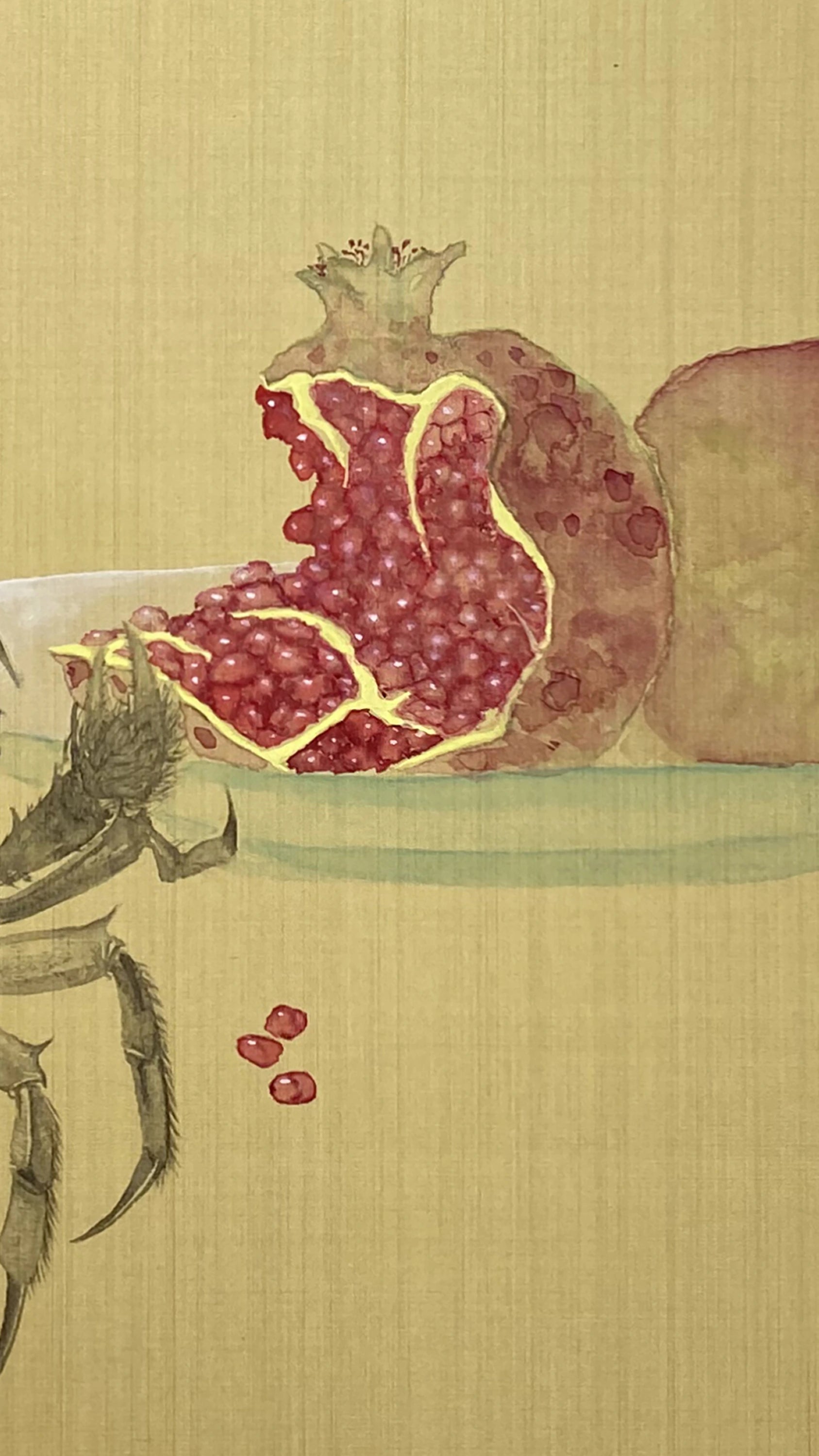 All of my arts are hand-drawn original paintings. This piece - Crab and Pomegranate - was painted on silk board, inspired by the view in autumn, harvest and prosperity. Pomegranate symbolizes “many blessings”, “Red and prosperous" and "Good luck and happiness”. This painting is with very good meaning for family reunion and unity, strength and inner peace.